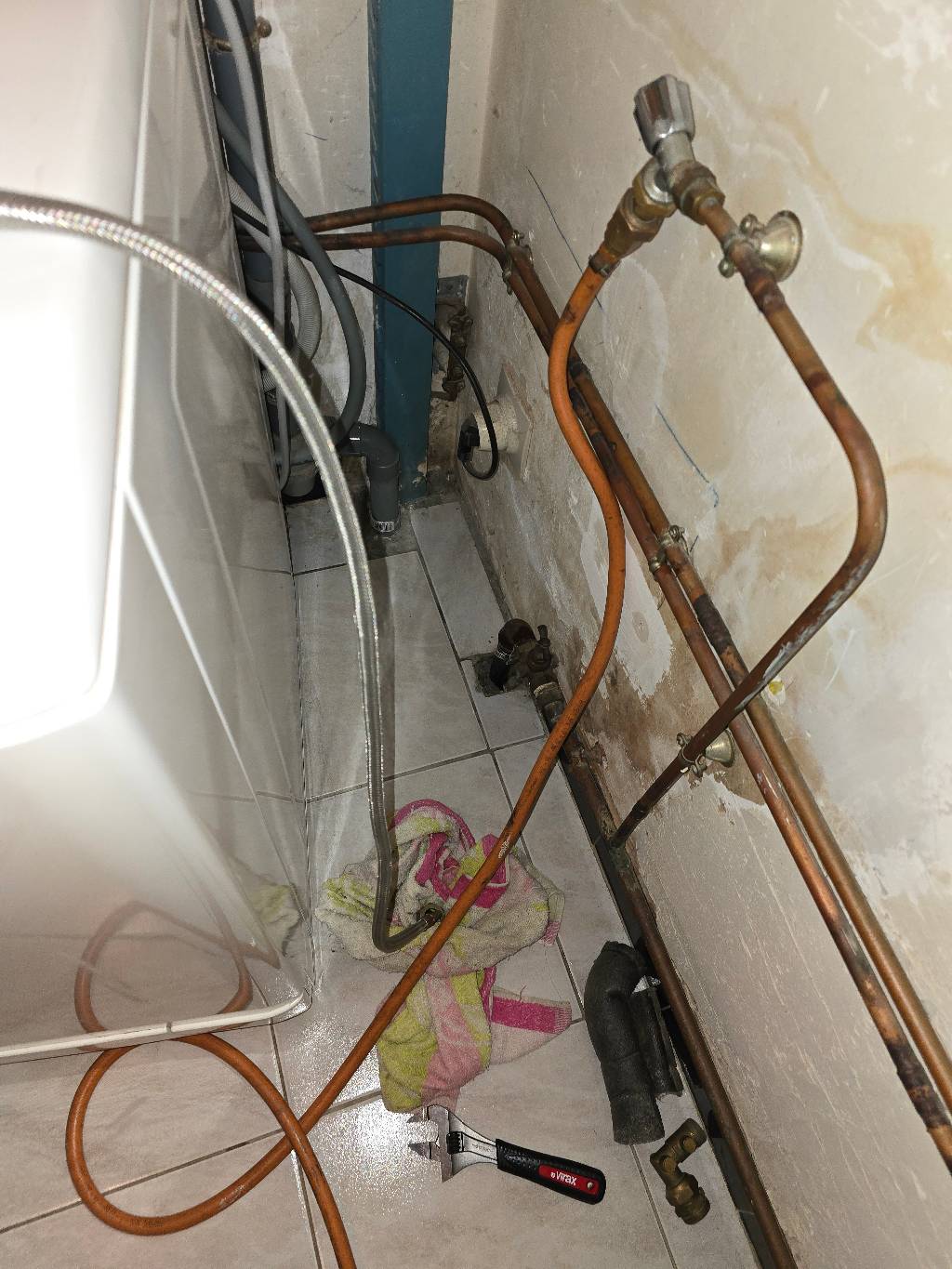 La fuite a été clairement identifiée au niveau de la pénétration du PE sous le sol de la buanderie, entraînant la surconsommation d’eau et la baisse de pression relevées.